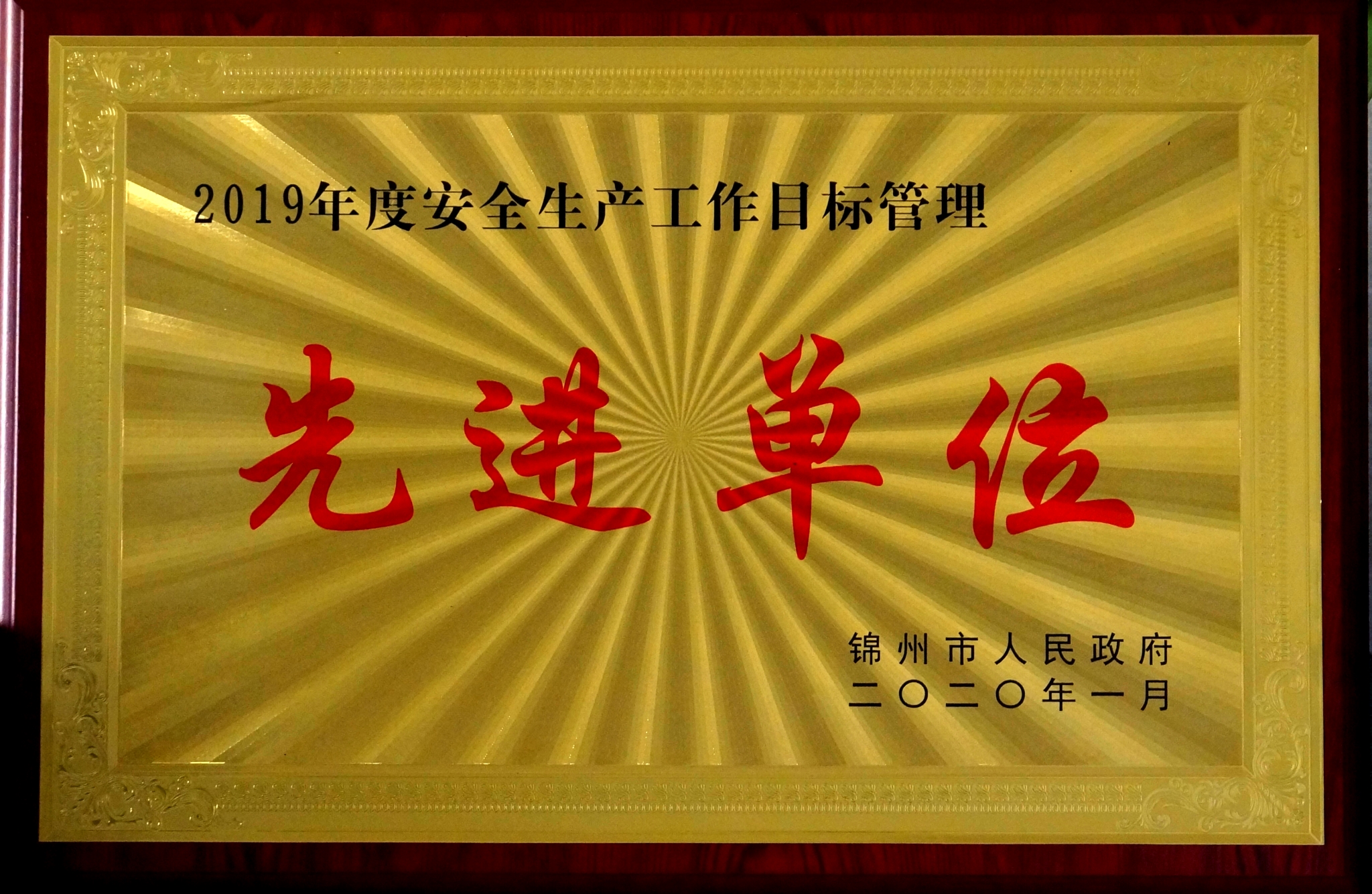 公司被錦州市政府授予“2019年的安全生產(chǎn)工作目標(biāo)管理先進(jìn)單位”榮譽(yù)稱(chēng)號(hào)